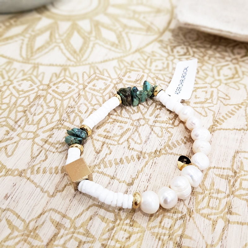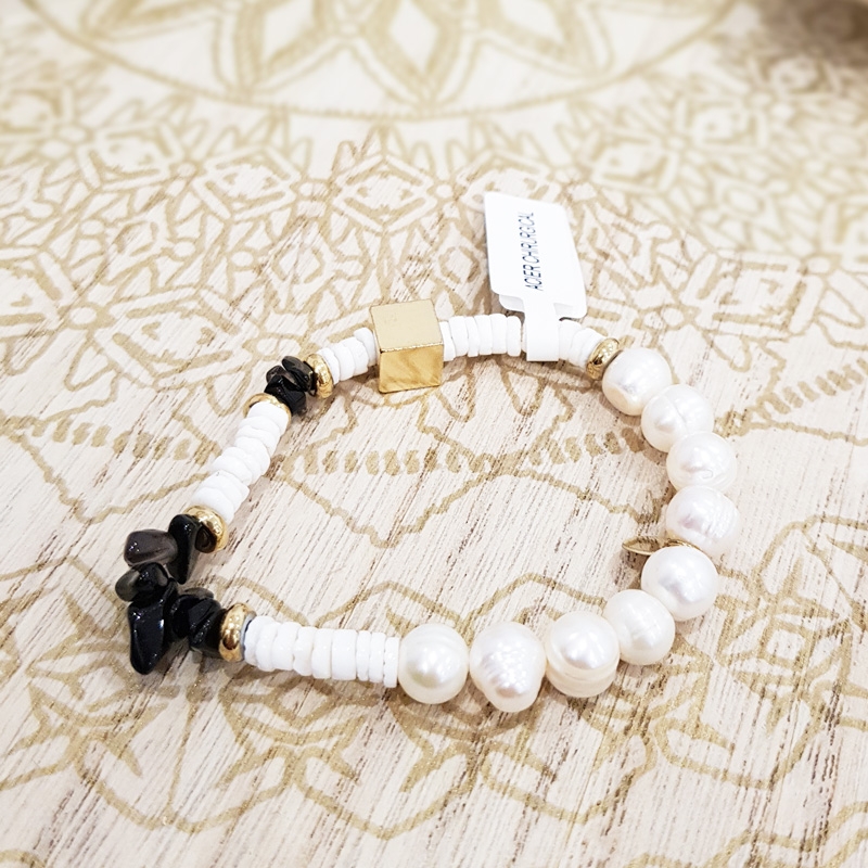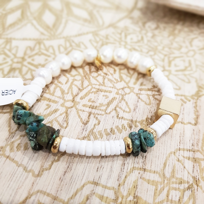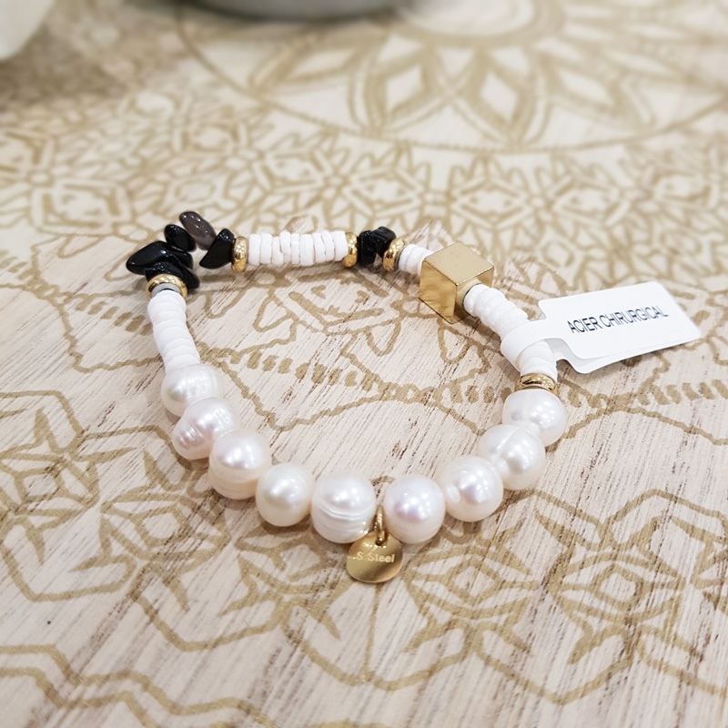 Perles nacrés et fantaisie en acier inoxydable.
