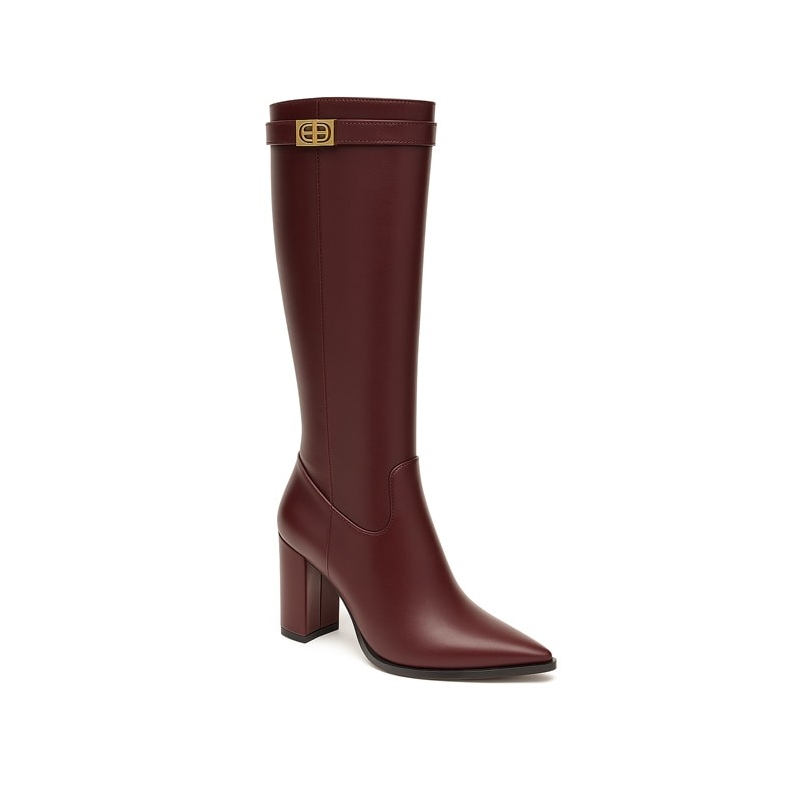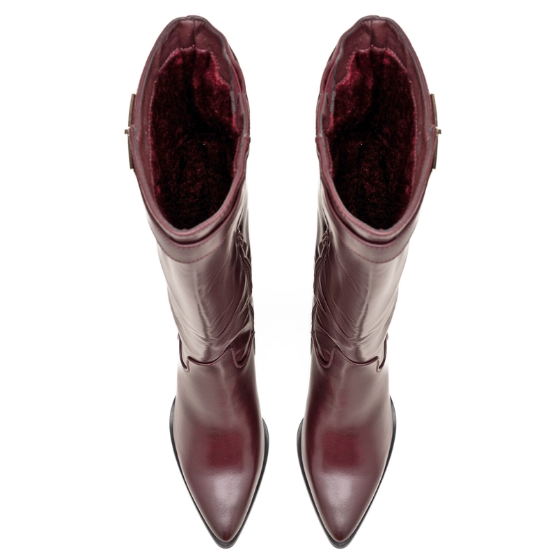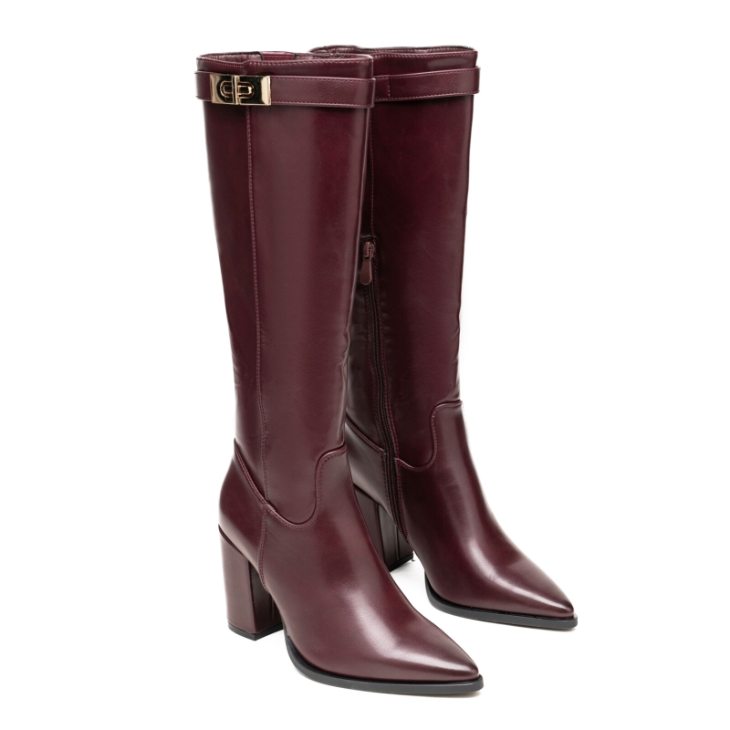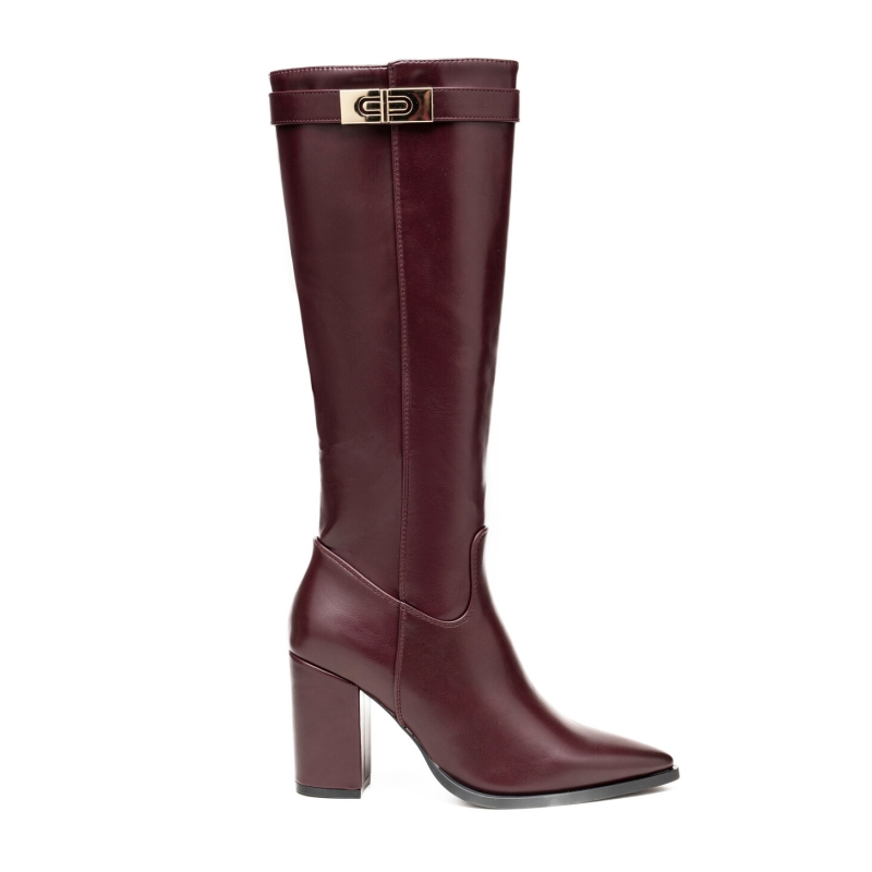 Bottes Louna femme đą : bottes de ville bordeaux Ă talon 7 cm, tige 35 cm et fermeture zippĂ©e. IntĂ©rieur fourrĂ© chaud et confortable, en 100% polyurĂ©thane.