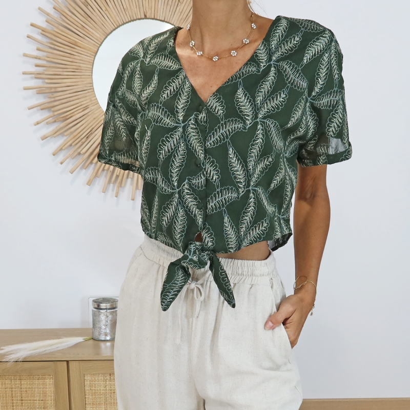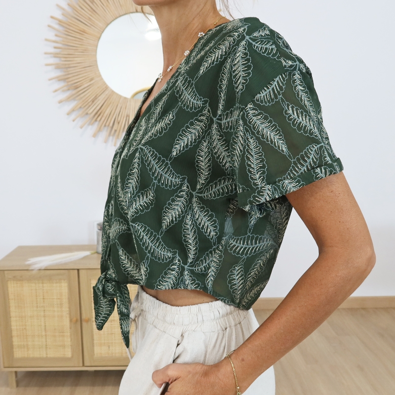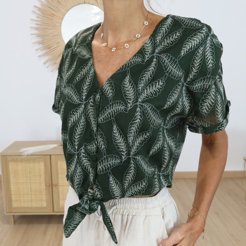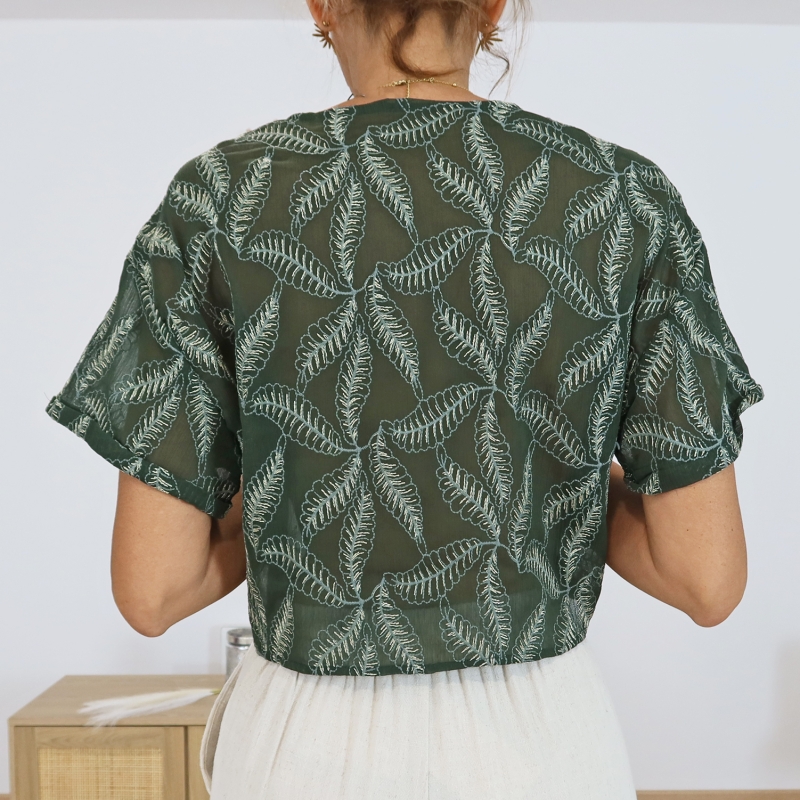 Chemisier court femme, chemisier voile, chemisier vert brodé, chemisier chic et léger, chemisier manches courtes, mode féminine élégante, vêtement tendance femme.