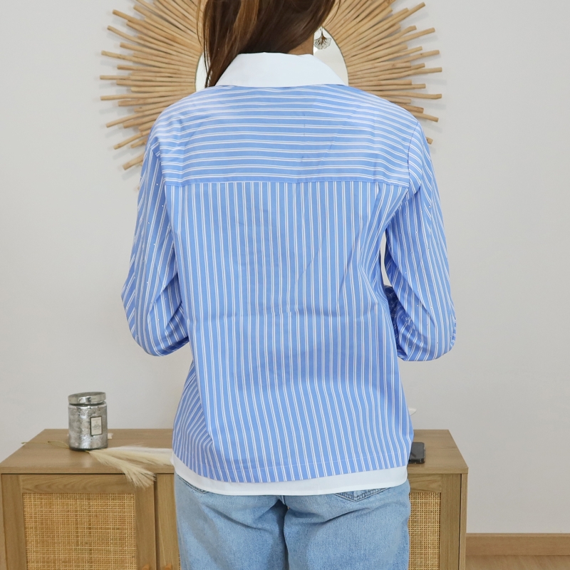 Chemise Martins femme 💙 : bleu rayé blanc avec strass discrets, coupe étroite et détails contrastants col, bas et poignets