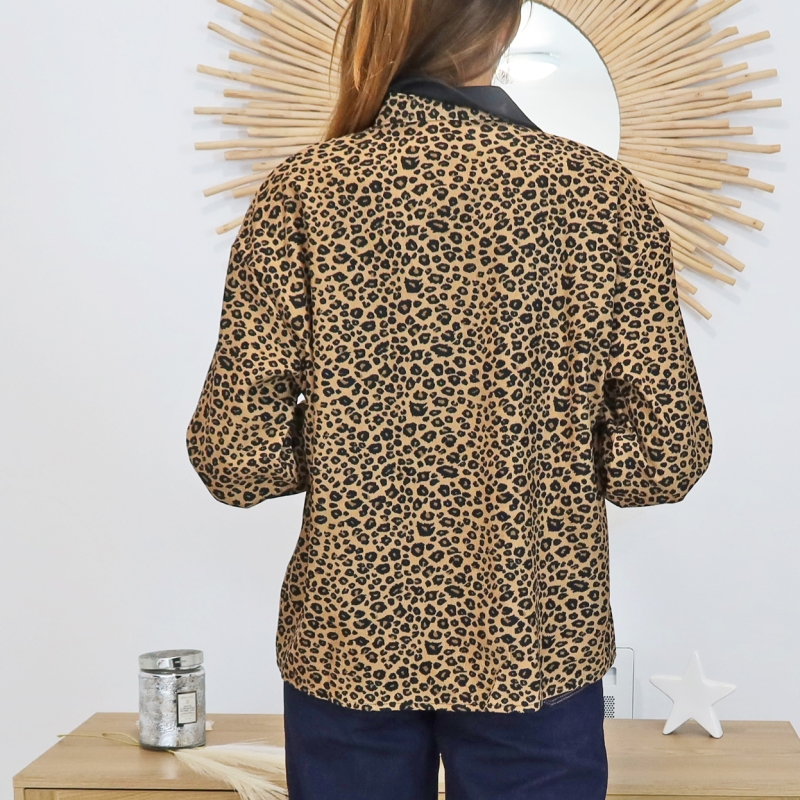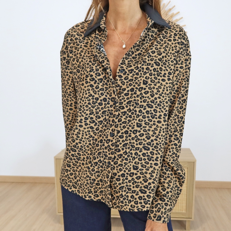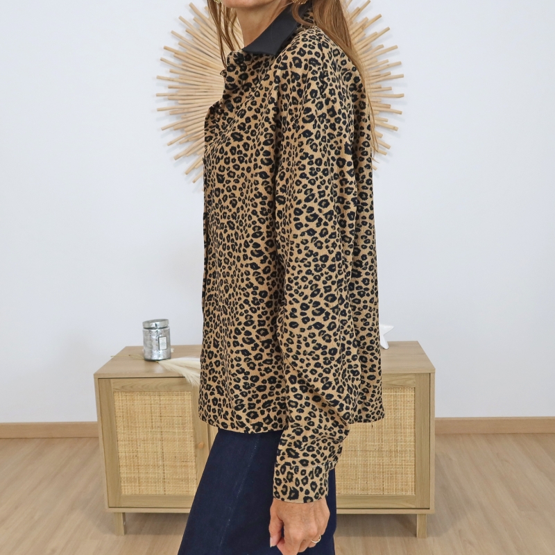 Chemise Tess femme 🐆 : velours côtelé fin, imprimé léopard camel/noir et col fantaisie simili cuir noir ✨ Disponible S/M et M/L.