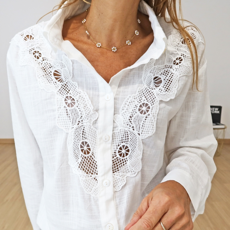 Confectionné en 100 % coton, il offre un tombé fluide et naturel, sublimé par une guipure raffinée qui souligne le col et la patte de boutonnage.