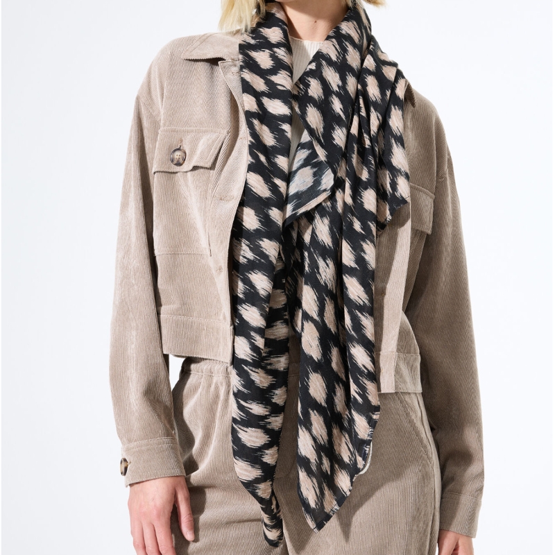 Adoptez lâĂ©lĂ©gance discrĂšte avec ce foulard carrĂ© 120x120 cm, un accessoire raffinĂ© qui se marie facilement Ă toutes vos tenues. Ses coloris sobres noir et taupe en font une piĂšce chic et polyvalente, parfaite aussi bien pour un look de bureau que pour une sortie habillĂ©e.
