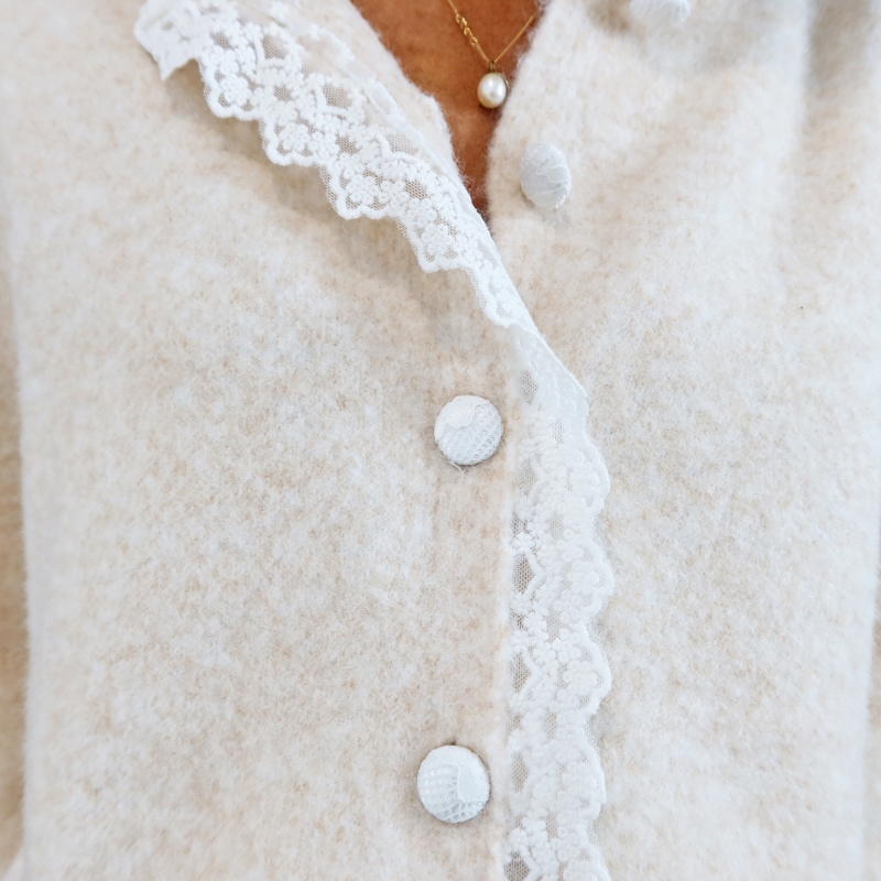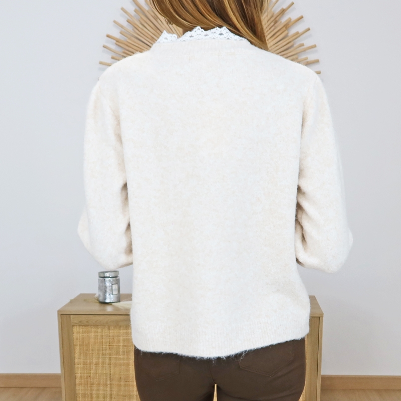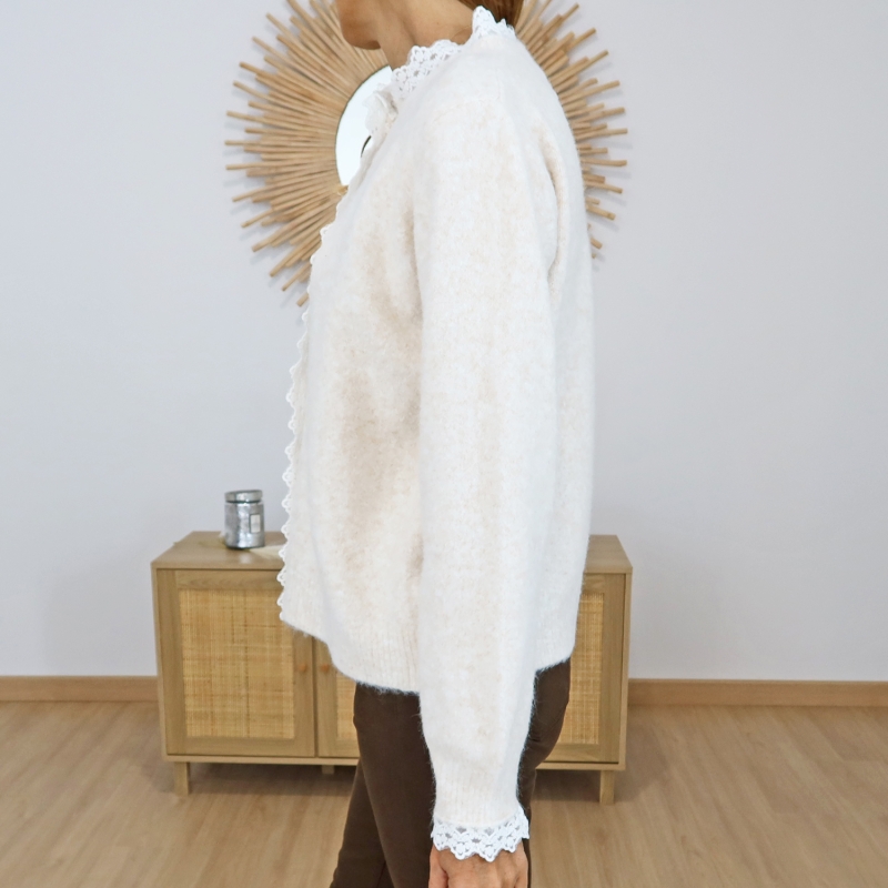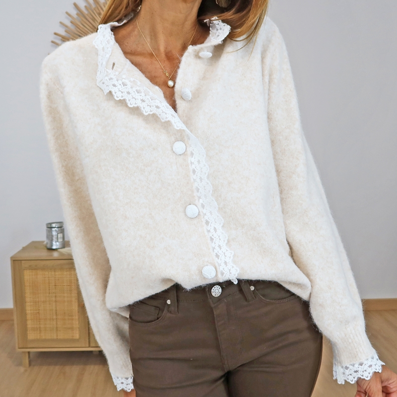 Gilet Gloria femme đŸ€ : coupe droite, coloris beige clair, ornĂ© de guipure raffinĂ©e le long de la patte boutonnĂ©e et aux poignets. Boutons fantaisie dentelle.