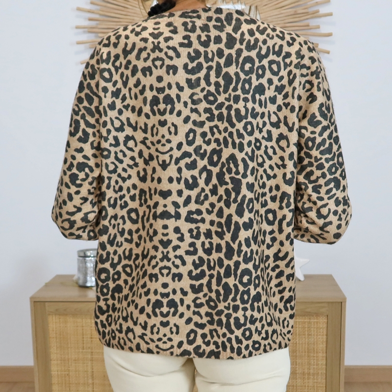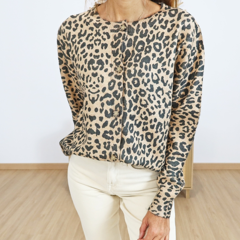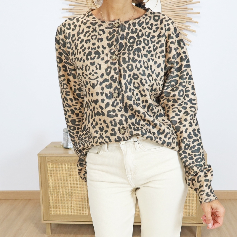 gilet femme imprimé caramel 🧡 : col arrondi, coupe droite et maille douce stretch. Taille unique.