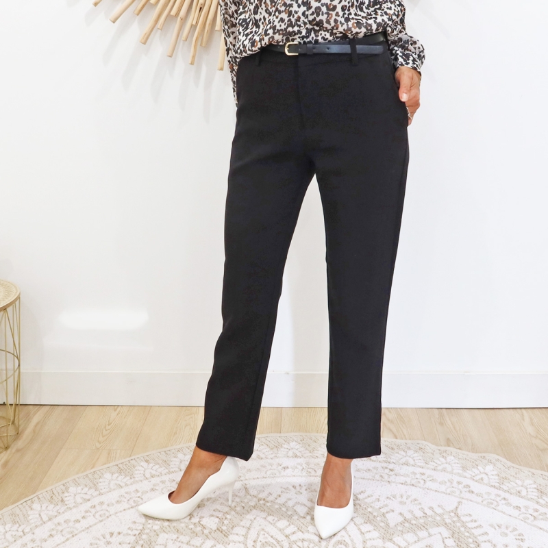 Ce pantalon coupe droite est un pantalon élégant et confortable, qui vous donne un look classique et moderne. Il est confectionné en 72% polyester, 23% viscose et 5% élasthanne, une matière souple et résistante qui vous offre une grande liberté de mouvement. Il a une fermeture éclair avec un bouton et une ceinture fine, qui vous assure un ajustement optimal et une touche de chic. Il a des poches en biais de chaque côté, qui lui donnent un aspect pratique et stylé. Le coloris noir est un coloris intemporel et facile à associer avec d’autres couleurs. La longueur entrejambe de 70 cm et la hauteur de taille de 25 cm vous assurent une coupe droite et flatteuse. Vous pouvez porter ce pantalon coupe droite avec un pull ou un chemisier pour un look casual, ou avec une veste ou un blazer pour un look plus habillé. Ce pantalon coupe droite est une pièce indispensable de votre garde-robe !