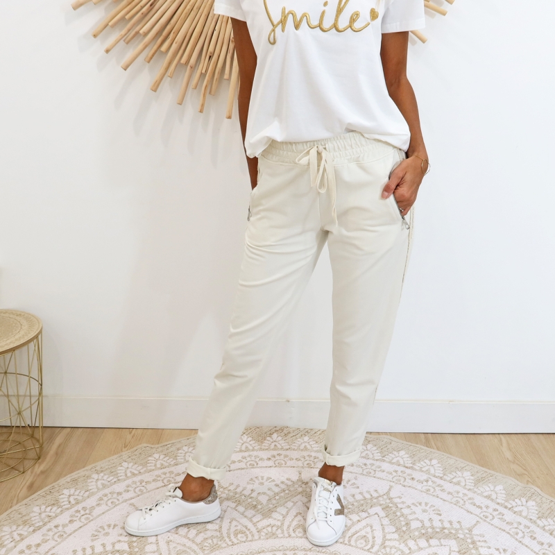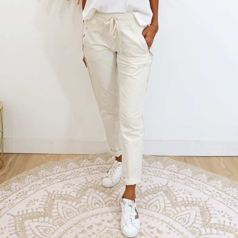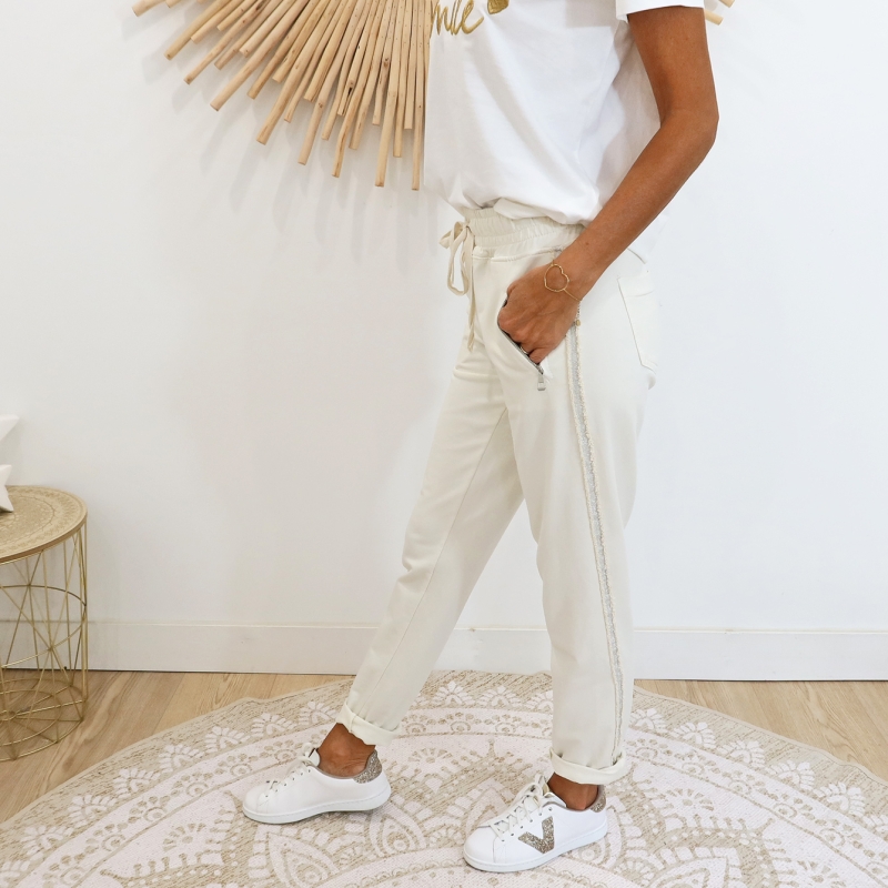 Bande argentée sur le coté, taille élastiquée + lacet à nouer