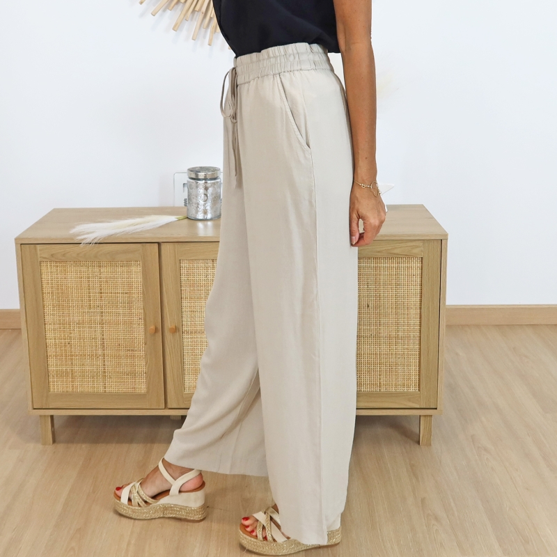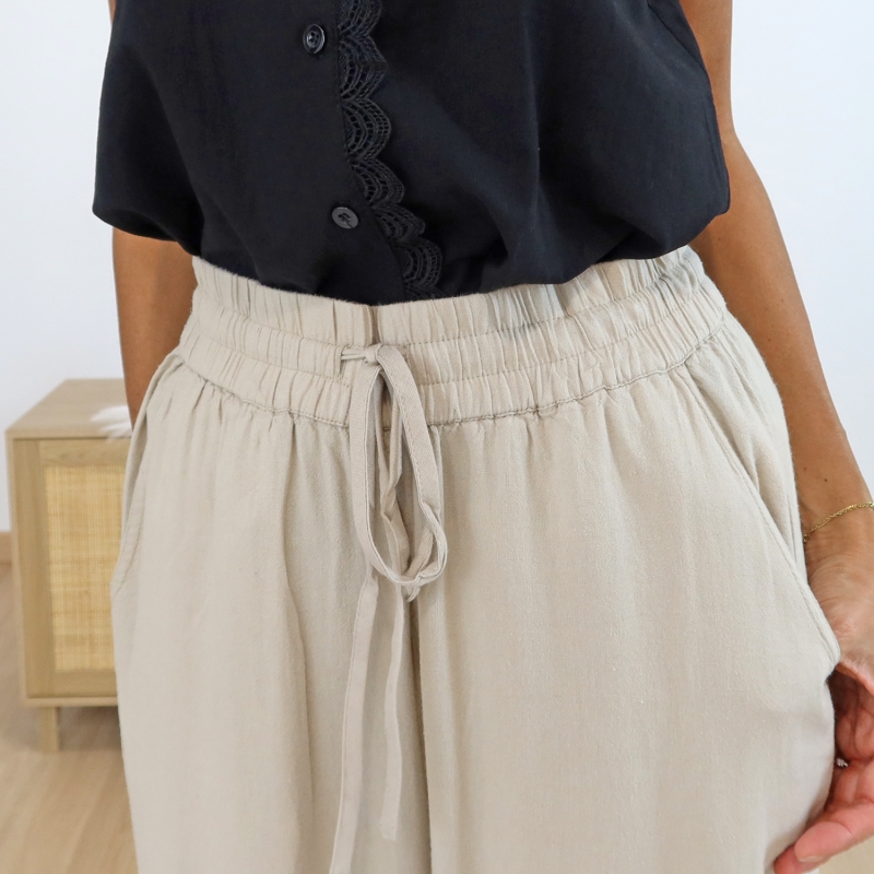 Son tissu composé de 70% viscose et 30% lin garantit une sensation de douceur et de fraîcheur, idéale pour les journées ensoleillées. La taille élastique accompagnée d’un lacet à nouer permet un ajustement parfait, mettant en valeur la silhouette tout en assurant une liberté de mouvement optimale.