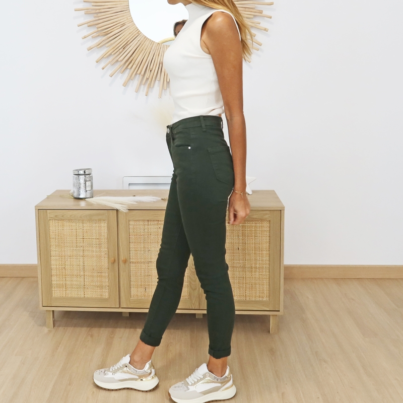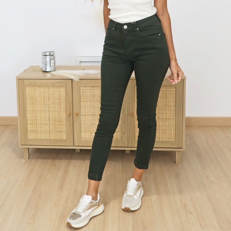 Jean slim femme kaki 👖 : coupe semi-haute, 5 poches pratiques. Confortable en coton stretch (98% coton, 2% Ă©lasthanne). Longueur 73 cm.