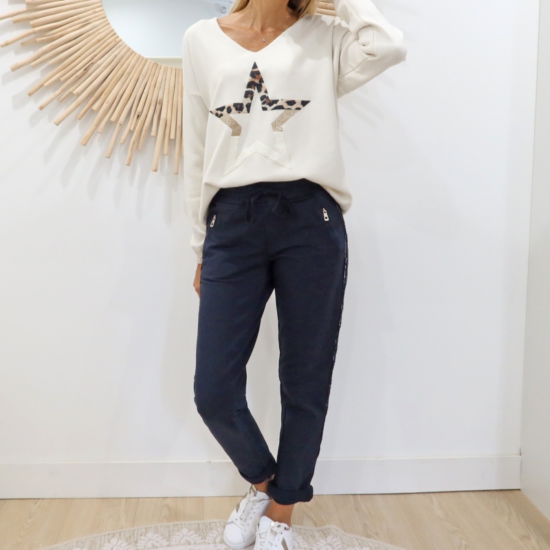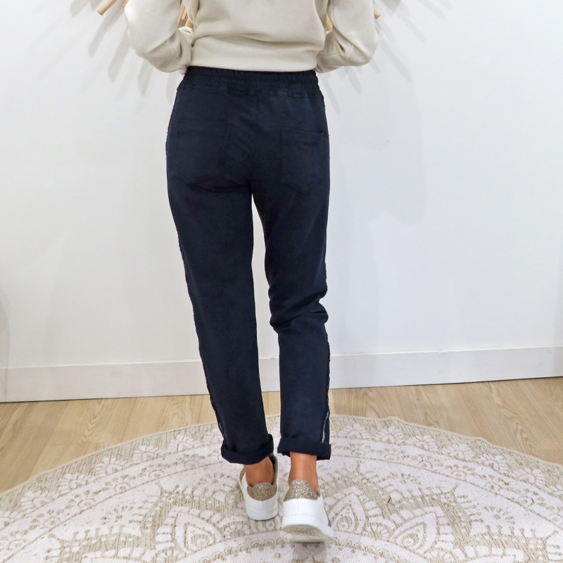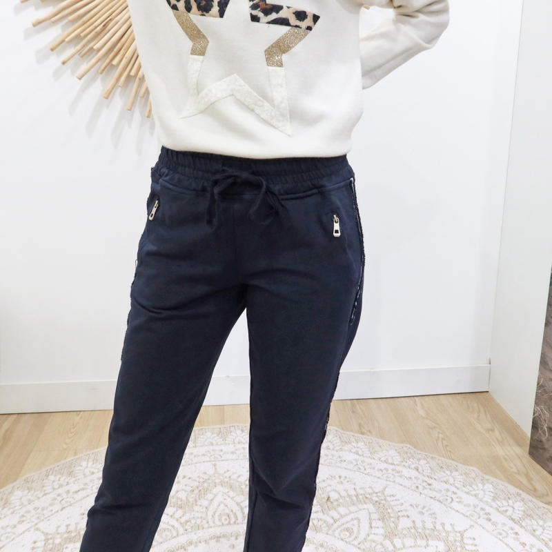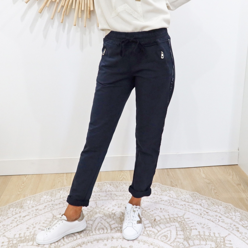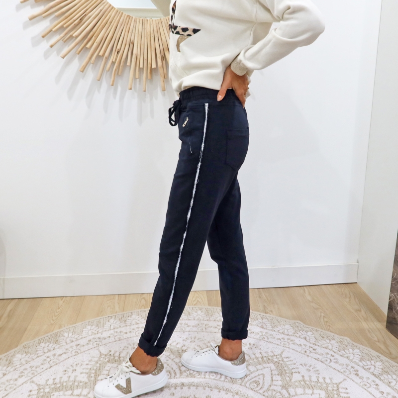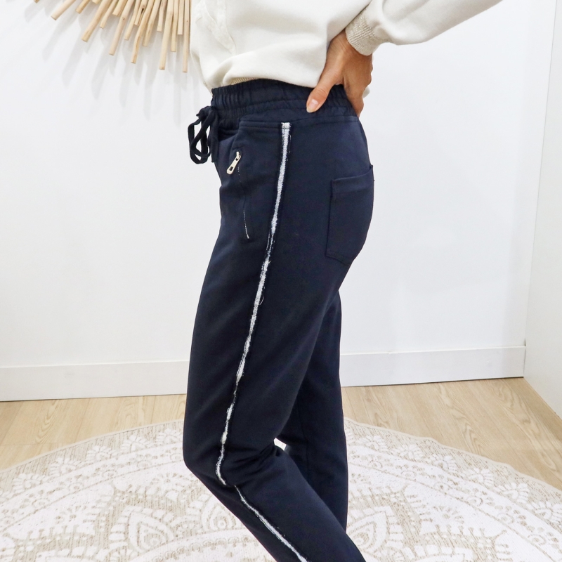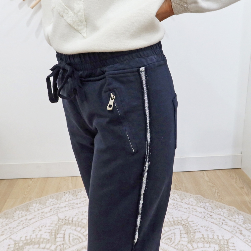 Pantalon jogging Saya bleu marine đ : coupe droite chic, bande argentĂ©e et confort absolu. Taille habituelle.