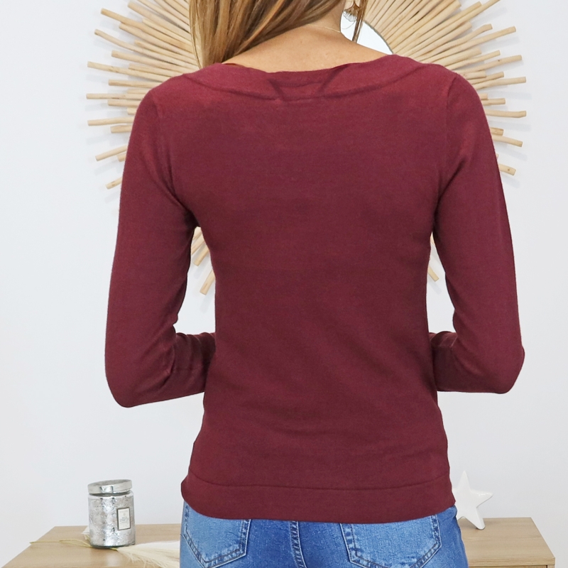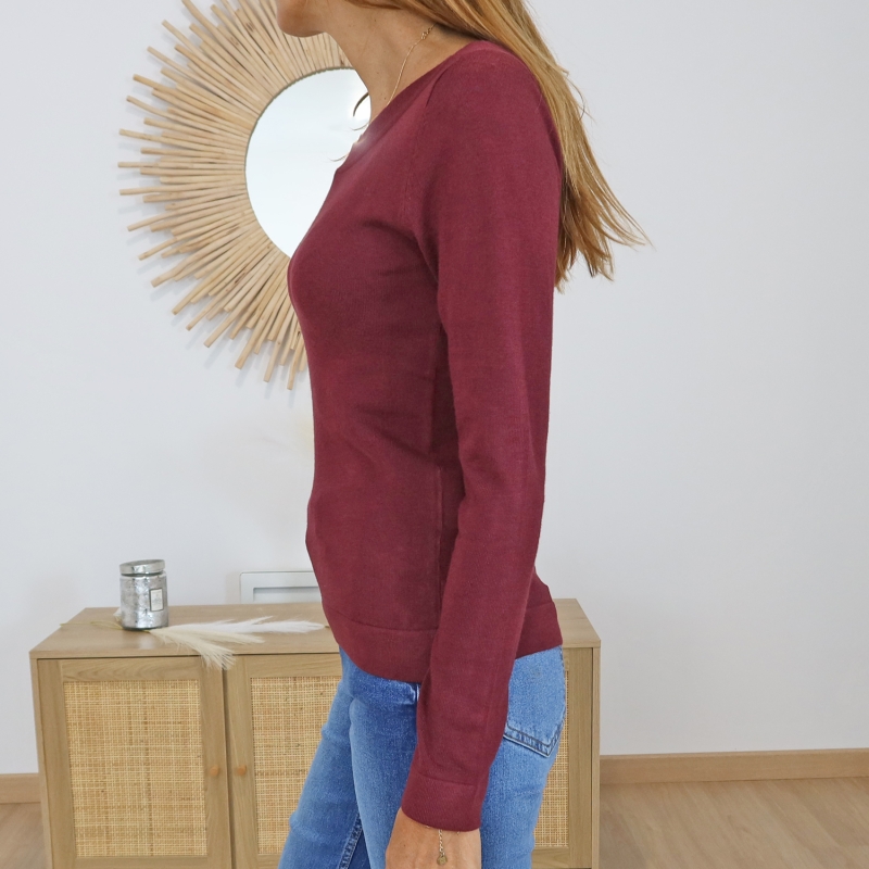 Pull Kalizza Kaffe femme ✨ : maille fine bordeaux, col bateau arrondi et coupe féminine, longueur 55 cm.