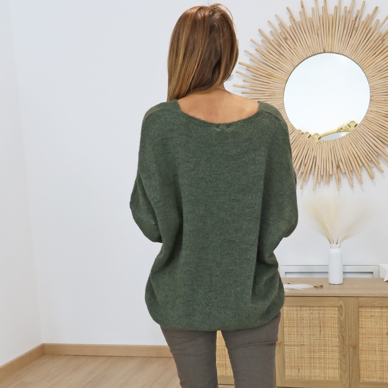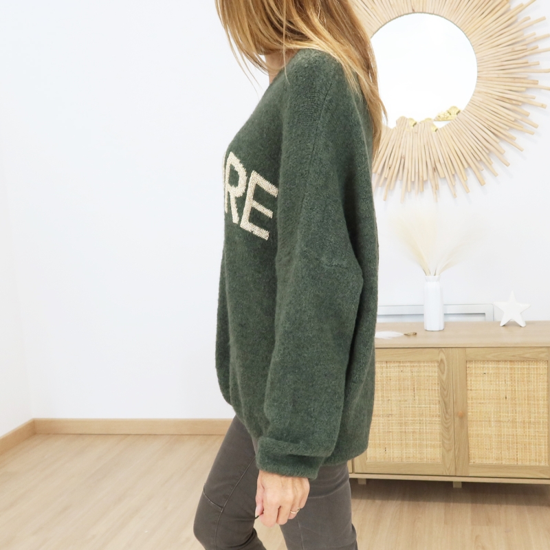 Pull oversize femme kaki đż : dĂ©colletĂ© V, impression dorĂ©e âJâAdoreâ et coupe large confortable. Taille unique S-XL.