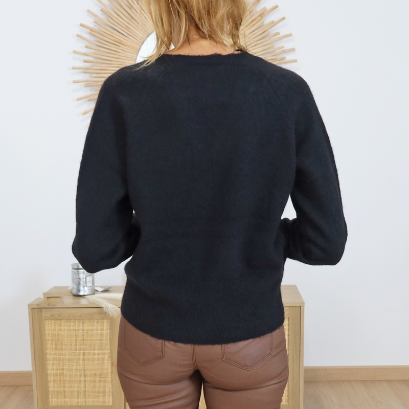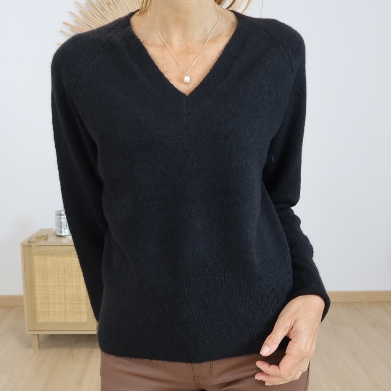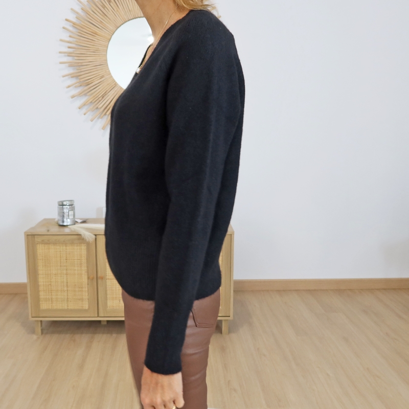 Un pull noir féminin au décolleté V chic, confectionné dans une maille douce et agréable.