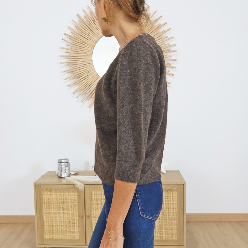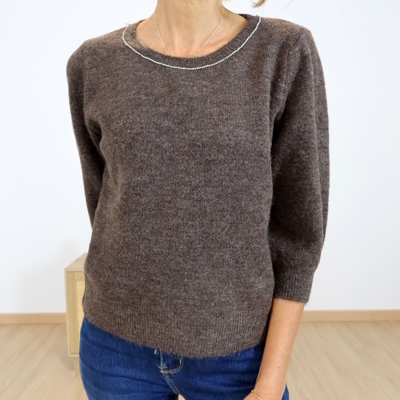 Pull KAMERIDITH Kaffe đŸ€Ž : manches 3/4, col rond ornĂ© de strass ✹, maille douce et chaude. ÉlĂ©gant, fĂ©minin et confortable. Taille habituelle conseillĂ©e.