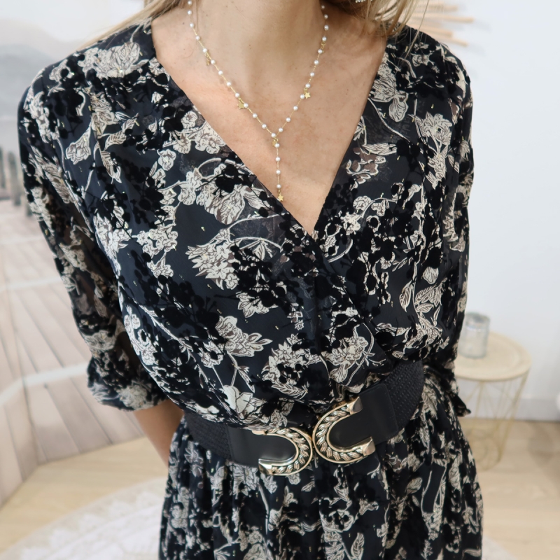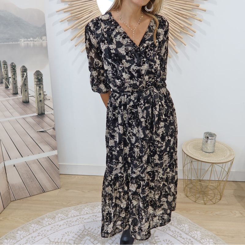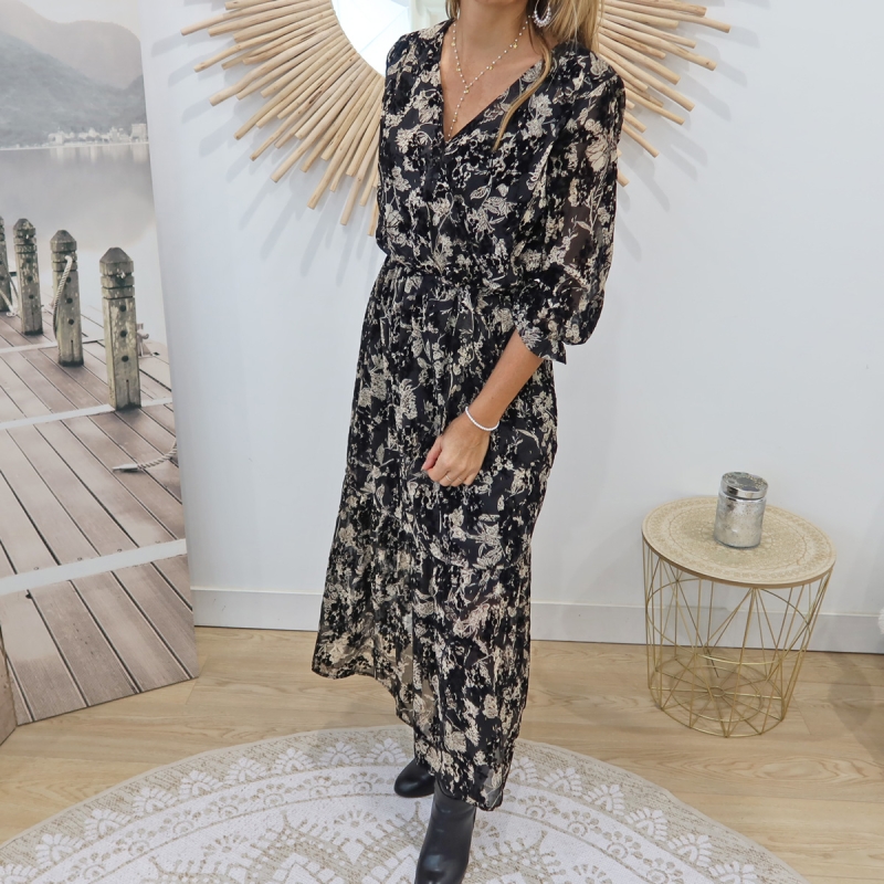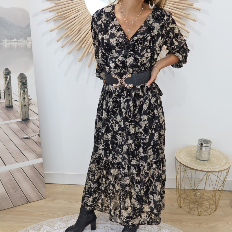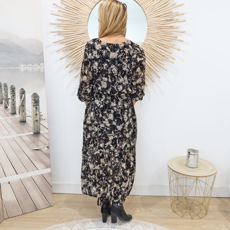 Robe longue en voile doublée jusqu'à mi cuisses, fantaisie motifs en reliefs suédine, coloris noir, beige et doré.