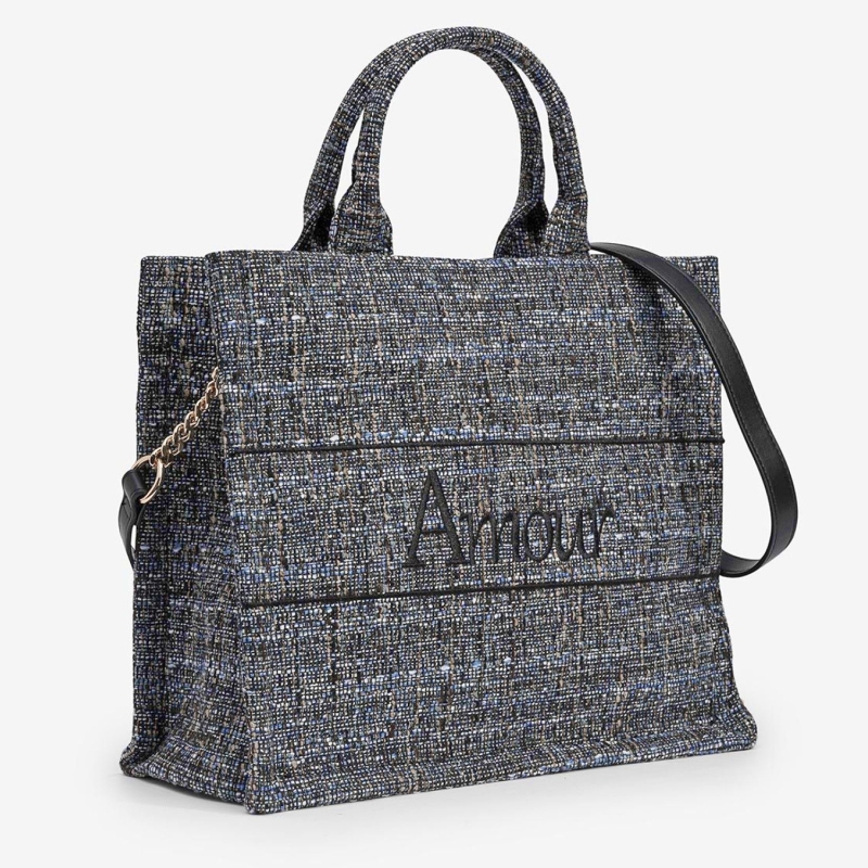 Sac à main femme HÉMERA : format rigide chic, coloris noir bleuté avec touches blanc, choco et beige. Chaînette dorée + poignée rigide. Broderie “Amour”.