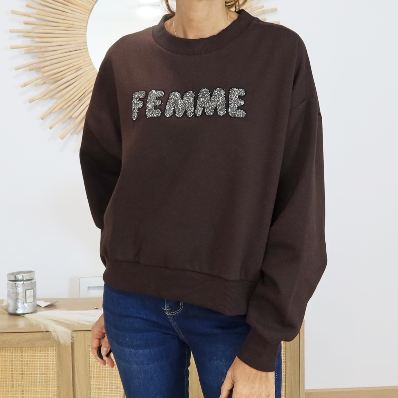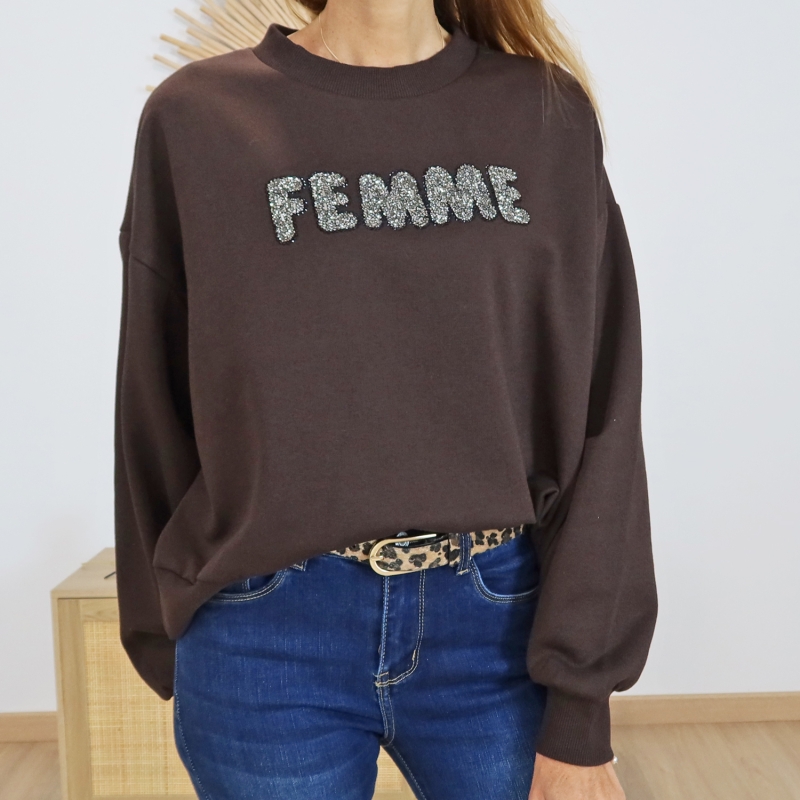 Sweat KALISE Kaffe đ€ : coloris chocolat, coupe Ă©vasĂ©e, inscription âFEMMEâ argentĂ©e pailletĂ©e âš. Col rond, matiĂšre molletonnĂ©e douce.