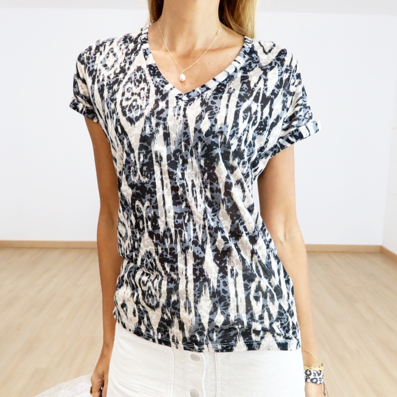 Le mannequin mesure 165 cm, présente la taille XS, sa taille habituelle chez Garcia
