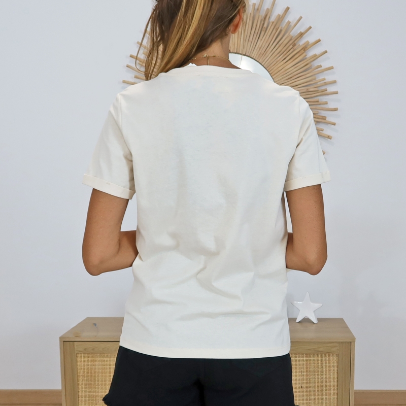 Sa teinte écru vanille douce et lumineuse met parfaitement en valeur l'impression "Bellissima", sublimée par des touches de bleu profond et de rose doré délicat. Avec une longueur de 60 cm, il s'adapte à toutes vos envies, que vous le portiez rentré dans un jean taille haute ou laissé lâche pour un look plus casual.