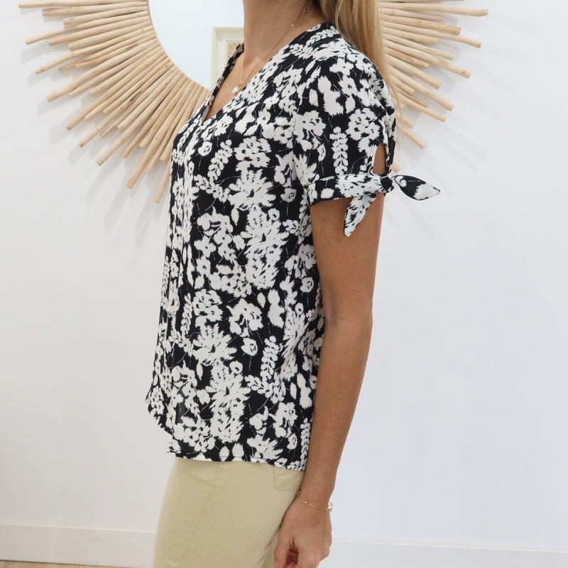 Décolleté en V, fantaisie petit nœud à nouer aux manches.