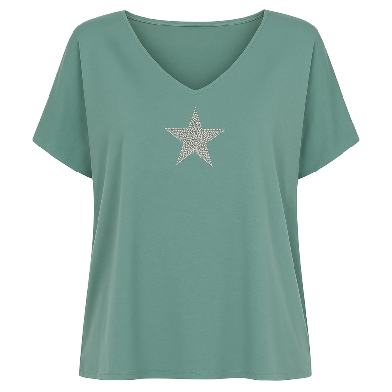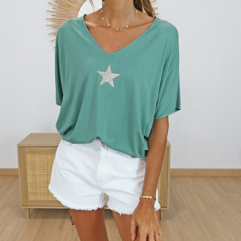 Sa matière douce et élasthanne procure une sensation agréable sur la peau, garantissant un confort optimal tout au long de la journée. Le décolleté en V flatteur ajoute une note de féminité discrète, tandis que la coupe oversize assure une aisance maximale. La fantaisie étoile dorée apporte une touche d'éclat et d'originalité, illuminant votre tenue avec subtilité.